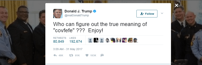 Even President Trump joined in the fun. He demonstrated a nigh unprecedented ability to poke fun of himself when he addressed the typo later that night (3:09 a.m. late, to be precise). “Who can figure out the true meaning of “covfefe” ??? Enjoy!” reads his tweet.